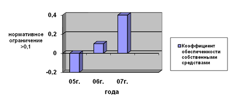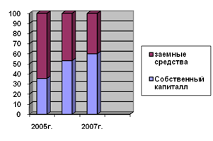 Рисунок 3. Сравнительный анализ собственных и заемных средств в общей доле валюты баланса. Как показывает вертикальный анализ, проведенный по данным таблицы 1 и рисунков 1 и 2, в структуре актива увеличилась доля оборотных средств (в 2005 году соотношение внеоборотных и оборотных средств в валюте баланса составляло 55 на 45%, в 2006- 48 на 52%, в 2007 – 36 на 64%), в пассиве баланса увеличилась доля собственного капитала по сравнению с заемными средствами (в 2005 году соотношение собственных и заемных средств составляло 36 на 64%, в 2006- 53 на 47%, в 2007- 60 на 40%). Увеличение доли оборотных активов в валюте баланса ОАО «НКМК» говорит об облегчении структуры баланса, то есть о возможности быстро мобилизовать свои активы для погашения обязательств. Доля заемного и собственного капитала к концу 2007 года составляет 40 и 60%, что соответствует норме, значит, предприятие является платежеспособным и финансово устойчивым. 2.4 Анализ показателей финансовой устойчивости Финансовая устойчивость определяется степенью обеспеченности запасов и затрат собственными и заемными источниками их формирования, а так же уравновешенностью активов и пассивов по срокам использования и по циклам обеспечиваются сбалансированность притока и оттока денежных средств [12, c.206] Анализ проводится по данным баланса путем расчета абсолютных и относительных показателей финансовой устойчивости, ликвидности и платежеспособности. Выделяют 4 типа финансовой устойчивости: - абсолютную финансовую устойчивость; - нормальную финансовую устойчивость; - неустойчивое финансовое состояние, при котором сохраняется возможность восстановления равновесия; - кризисное финансовое состояние, при котором организация находится на грани банкротства. Анализ финансовой устойчивости ОАО «НКМК» представлен в таблице 3 и на рисунке 4. Таблица3