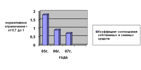 Рисунок 7. Динамика изменения коэффициента соотношения заемных и собственных средств. По данным таблицы 3 за анализируемый период тип финансовой устойчивости ОАО «НКМК» изменился из неустойчивого финансового состояния в 2005 году (0;0;1) в нормальное финансовое состояние в 2006году (0;1;1), а затем в абсолютную финансовую устойчивость в 2007г. (1;1;1). Позитивная динамика наблюдается из-за увеличения за последние 3 года доли оборотных активов (2005год- 8759140тыс. руб., 2006 – 8135676тыс. руб., 2007- 11132584 тыс.руб.) и собственного капитала ( 2005 год- 567335 тыс.руб., 2006- 8261877 тыс.руб., 2007- 10445459 тыс.руб.), а так же уменьшении внеоборотных активов ( по сравнению с 2005 годом на 817 215 тыс.руб.). При рассмотрении динамики изменения коэффициентов показанных на рисунках 4,5,6, и 7 можно сказать, что в 2007 году все коэффициенты соответствуют нормативным показателям ( коэффициент покрытия равен 1,8>1, коэффициент автономии- 0,6>0,5, коэффициент обеспеченности собственными средствами -0,4>0,1, коэффициент соотношения собственных и заемных средств- 1,8>1). 2.5 Анализ показателей ликвидности и платежеспособности Анализ платежеспособности предприятия осуществляют путем соизмерения наличия и поступления средств с платежами первой необходимости. Различают текущую и ожидаемую (перспективную) платежеспособность. Текущая платежеспособность определяется на дату составления баланса. Предприятие считается платежеспособным, если у него нет просроченной задолженности поставщикам, по банковским ссудам и другим расчетам. Ожидаемая (перспективная) платежеспособность определяется на конкретную предстоящую дату путем сравнения суммы его платежных средств со срочными (первоочередными) обязательствами предприятия на эту дату [6, c.122]. Анализ ликвидности баланса заключается в сравнении активов сгруппированных по степени их ликвидности с пассивами, сгруппированными по степени срочности погашения обязательств. Анализ показателей ликвидности и платежеспособности представлены в таблице 4 и на рисунках 8,9,10 и 11. Таблица 4