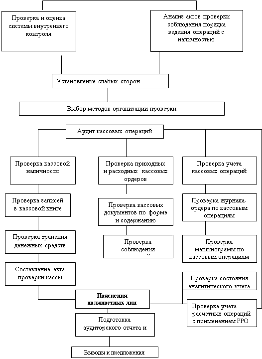 Рис.1. Порядок проведения аудита денежных средств в кассе 3.3. Аудит операций по счетам в банке. Целью аудиторской проверки операций на расчетном, валютном и других счетах в банке является формирование мнения о достоверности бухгалтерской отчетности по разделу "Денежные средства" и соответствии применяемой методики учета денежных средств на счетах в банке действующим в Украине нормативным документам. Ведется проверка полноты и правильности синтетического учета операций по расчетному счету. Такая проверка проводится по каждому счету, открытому в банке. Если по договору банковского счета предусмотрена выплата банком процентов за пользование денежными средствами, аудитор должен проверить, начисляет ли организация доходы ежемесячно или отражает их по факту зачисления процентов на расчетный счет. При аудите операций по расчетному счету аудитор также проверяет: • порядок ведения учетных регистров; • ведутся ли регистры синтетического учета по каждому расчетному счету, открытому в банке, составляется ли сводный регистр; • своевременность отражения в регистрах синтетического учета операций по движению денежных средств на расчетном счете; производятся ли записи в учетные регистры по каждой выписке банка; • тождественность записей в учетных регистрах и в выписке банка. Проверяя полноту зачисления денежных средств, перечисленных покупателями и заказчиками в оплату поставленных материально-производственных запасов, выполненных работ и оказанных услуг, необходимо сверить записи по дебету счета 31 "Текущий счет" с кредитовыми записями учетных регистров по счетам 36 "Расчеты с покупателями и заказчиками", 37 "Расчеты с разными дебиторами и кредиторами". Поступление денежных средств от финансово-кредитных организаций в виде кредитов проверяют путем встречной сверки записей по регистрам бухгалтерского учета по счетам 50 "Расчеты по краткосрочным кредитам и займам", 60 "Расчеты по долгосрочным кредитам и займам", 31 "Текущий счет", а также сверки выписок и приложенных к ним документов. Особое внимание аудитор должен уделить проверке полноты оприходования наличных денежных средств, сдаваемых в кассу банка (кредитной организации). Для этого проводят встречную проверку записей с данными учетного регистра по кредиту счета 30 "Касса ". Перечисление денежных средств с расчетного счета в погашение задолженности поставщикам следует анализировать в разделе аудита расчетных операций по счету 63 "Расчеты с поставщиками и подрядчиками", чтобы установить, насколько реально и обоснованно они использованы. Детальной проверке должны быть подвергнуты операции по счету 31 "Текущий счет" в сопоставлении со счетами учета затрат (23 "Производство", 91 "Общехозяйственные расходы ", и др.), так как в данном случае может быть сокрыто перечисление средств за невыполненные работы, неоказанные услуги. Пересекающейся процедурой проверки операций по расчетному счету является проверка списания денежных средств со счета и полноты оприходования наличных денег в кассу. Аудитор должен проверить: • приложена ли к выписке банка по операции снятия наличных денег квитанция к приходному кассовому ордеру; • тождественность записей в регистрах синтетического учета по кредиту счета 31 "Расчетный счет" и дебету счета 30 "Касса". Выявленные в ходе проверки операций по ра
