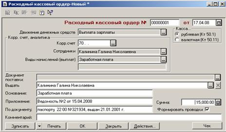 Рис.8 Печатная форма приходного кассового ордера в системе программы 1:С Бухгалтерия Расходный кассовый ордер предназначен для оформления выдачи денег из кассы. При вводе документа указываются данные о лице, которому выдаются деньги из кассы, сумма и необходимые для отражения документа в бухгалтерском учете данные. Для заполнения поля «Выдать» может использоваться справочник сотрудников или справочник контрагентов. При нажатии кнопки «Печать» формируется стандартный табличный документ системы «1С: Предприятие» (печатная форма расходного кассового ордера) (рис.9). При проведении документа автоматически формируются бухгалтерские проводки, отражающие данный документ в бухгалтерском учете. По дебету выступает указанный пользователем в накладной корреспондирующий счет, а по кредиту - 50-й.