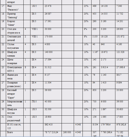 где N - срок службы Необходимо учесть, что расчетный коэффициент, определяемый при этом методе, различен в разные периоды эксплуатации, но применяется к постоянной величине амортизируемой стоимости. При использовании данного метода сумма амортизационных отчислений в первые годы эксплуатации значительно выше, чем в последующие. Ознакомившись с методами ускоренного начисления амортизации основных средств, четко определили, что эти методы позволяют списать максимальную часть амортизируемой стоимости в первые годы работы основного средства. Таким образом, компания имеет возможность максимально эффективно возмещать расходы по приобретению основных средств.[2,c56] К различным видам основных средств допускается применение различных методов начисления амортизации. При этом к одному виду (группе) основных средств следует применять не более одного метода. Выбранные компанией методы начисления амортизации должны определяться учетной политикой и применяться последовательно от одного отчетного периода к другому. 4. Расчет и учет амортизации основных средствУчетной политикой ТОО "Наурыз" начисление амортизации по основным средствам, вновь введенным в эксплуатацию, начинается, а по выбывшим - прекращается с первого числа месяца, следующего за месяцем ввода или последним месяцем, в котором стоимость этих объектов была полностью перенесена на себестоимость продукции (работ, услуг). В соответствии с учетной политикой ТОО "Наурыз" начисление амортизации производится по всем видам основных средств с использованием равномерного (прямолинейного) списания стоимости. При методе равномерного списания сумма амортизационных отчислений определяется исходя из: - срока полезной службы, для более точного определения которого следует учитывать всю имеющуюся информацию о состоянии объекта на данный момент; - предельных норм амортизации, установленных налоговым законодательством Республики Казахстан. Нормы не должны превышать предельных норм, установленных налоговым законодательством. Например, 30 марта 2007 г. для офиса в ТД "Сулпак" приобретен холодильник LG GR-642BEFE стоимостью 133 380 тенге (включая НДС 14%). Установлен срок полезной службы в 5 лет, предполагаемая ликвидационная стоимость в конце срока полезной службы несущественна. Данная хозяйственная операция была отражена в бухгалтерском учете ТОО "Наурыз" следующим образом: 1. На фактическую себестоимость приобретенного холодильника (стоимость без НДС) Д-т 2415 "Прочие основные средства" - 117 000 тенге К-т 3311 "Счета к оплате" - 117 000 тенге 2. На сумму НДС Д-т 1421 "Налог на добавленную стоимость" - 16 380 тенге К-т 3311 "Счета к оплате" - 16 380 тенге 3. Произведена оплата безналичным путем Д-т 3311 "Счета к оплате" - 133 380 тенге К-т 1041 "Денежные средства" - 133 380 тенге 4. Ежегодная амортизация - 23 400 тенге (117 000 : 5 лет) Д-т 7111 "Расходы по амортизации" - 23 400 тенге К-т 2424 "Накопленная амортизация прочих основных средств" 23 400 тенге Расчет амортизации методом равномерного списания стоимости приведен в таблице 3. Таблица 3 - Расчет амортизации методом равномерного списания стоимости