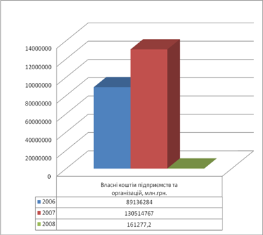 Рис 2.1 Порівняльний аналіз використання власних засобів підприємств за 2006-2008гг. Найбільший об'єм використання був присутній в 2007г., але вже в 2008г. він скоротився на 13 035 349 млн. грн. Це говорить про те, що в 2008 р. підприємства не мали досить високого рівня прибутковості, щоб після виплати всіх податків і зборів направити на відтворення великі суми. Зв'язаний це все з кризовими явищами, як на території України, так і на світовому рівні. У 2008г. підприємства фінансувалися в основному за рахунок бюджетних надходжень (15 402,9 млн. грн.), а також за рахунок кредитів в банках і інших позик (42 981 млн. грн.). Детальніше джерела фінансування підприємств за 2008 р. можна розглянути в нижче приведеній таблиці. Таблиця 2.1 Капітальні інвестиції за джерелами фінансування за 2008р.