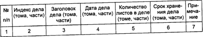 В описях дел постоянного хранения графа 6 опускается. Каждое дело вносится в опись под самостоятельным порядковым номером. При наличии нескольких томов (частей) каждый из них также имеет свой порядковый номер. Систематизацию дел в описи и присвоение номера описи структурного подразделения осуществляет архив организации. В конце описи делается итоговая запись. В ней указывается цифрами и прописью число дел, числящихся по описи, первый и последний номер дел по описи. В данную опись внесено____дел с №____по №___ , в том числе: литерные номера: пропущенные номера: Опись дел подписывается составителем с указанием его должности, согласуется с руководителем службы документационного обеспечения управления и утверждается руководителем структурного подразделения. Перед утверждением опись должна быть одобрена ЭК структурного подразделения. Опись дел структурного подразделения организации составляется в двух экземплярах. Один остается в структурном подразделении, а второй передается вместе с делами в ведомственный архив, где служит основой для составления годового раздела сводной описи дел организации. Годовой раздел описей на дела постоянного хранения, предназначенный для последующей передачи в государственный архив, подлежит утверждению ЭПК архивного учреждения. Он печатается в четырех экземплярах, заверяется руководителем службы документационного обеспечения управления, подписывается председателем ЭК (после утверждения описи комиссией) и согласовывается с руководителем организации. В соответствии с утвержденными годовыми разделами описи организация обязана в установленные сроки сдать, а государственный архив принять на хранение внесенные в опись дела[3]. 1.3 Архивное хранение документов Хранение документов организации составляется по установленной форме на основании номенклатур дел структурных подразделений, разработанных по аналогичной форме, согласованных ими с архивом и подписанных руководителями этих подразделений. Номенклатура дел организации оформляется на общем бланке организации. Номенклатура дел организации визируется руководителем архива или лицом, ответственным за архив, подписывается руководителем службы или лицом, ответственным за документационное обеспечение управления, и после одобрения ЦЭК (Центральная экспертная комиссия) организации направляется на согласование с ЭПК (Экспертно-проверочная комиссия) соответствующего архивного учреждения, после чего утверждается руководителем организации. После утверждения номенклатуры дел организации структурные подразделения получают выписки соответствующих ее разделов для использования в работе. Согласованная с архивным учреждением номенклатура дел в конце каждого года уточняется, утверждается руководителем организации и вводится в действие с 1 января следующего календарного года. Номенклатура дел согласовывается с архивным учреждением не реже одного раза в 5 лет. Номенклатура дел[4] составляется на основе изучения состава и содержания документов, образующихся в деятельности организации. При составлении номенклатуры дел следует руководствоваться уставом или положением об организации, положениями о ее структурных подразделениях, штатным расписанием, номенклатурой дел организации за прошлый год, описями дел постоянного и временного