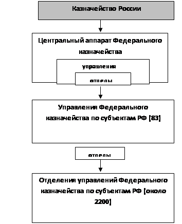 Рис.1. Существующая система органов Федерального казначейства В состав Управления Федерального казначейства по Ивановской области входят 22 отделения Федерального казначейства. Родниковское отделение УФК по Ивановской области (далее - Отделение) включает следующие подразделения: отдел расходов, отдел бюджетного учета и отчетности, структурное подразделение "Специалист по административной и кадровой работе". Руководитель Отделения: - руководит работой Отделения на правах единоначалия; - представляет Отделение без доверенности во всех взаимоотношениях с учреждениями, предприятиями и организациями; - несет персональную ответственность за выполнение возложенных на Отделение задач и осуществление им своих функций; - координирует и контролирует деятельность всех отделов; - проводит мероприятия, направленные на обеспечение неуклонного соблюдения законов и принимает меры к предупреждению нарушений действующего законодательства; - проводит работу по созданию работникам Отделения необходимых условий труда, соблюдению ими техники безопасности, правил пожарной безопасности; - издает в пределах компетенции Отделения приказы; - обеспечивает соблюдение финансово-штатной дисциплины, сохранность денежных средств и материальных ценностей; - ведет прием граждан, рассматривает предложения, заявления и жалобы граждан и принимает по ним необходимые меры; - контроль за соблюдением сроков подготовки ответов, - разрабатывает структуру Отделения; - составляет штатное расписание Отделения в пределах установленного фонда оплаты труда и численности работников и представляет его на утверждение руководителю УФК По Ивановской области; - проводит работу по подбору кадров, их расстановке, повышению квалификации; - назначает на должность и освобождает от должности работников Отделения; - представляет в установленном порядке особо отличившихся работников к присвоению почетных званий и наград; Работники Отделения являются государственными гражданскими служащими. Права и обязанности работников Отделения, их социальные и правовые гарантии, связанные с исполнением обязанностей, устанавливаются в соответствии с Федеральным Законом «О государственной гражданской службе». С момента создания казначейской системы технологии, используемые Федеральным казначейством, существенно изменились. Трудоемкость казначейских операций постепенно снижается в связи с практической реализацией проекта «Модернизация казначейской системы Российской Федерации». Внедрение принципиально нового прикладного программного обеспечения Автоматизированной системы Федерального казначейства (далее – АСФК) повлечет за собой устранение дублирования функций между органами Федерального казначейства различных уровней (ЦАФК – первый уровень, УФК – второй уровень, ОФК – третий уровень) и их рациональное перераспределение. Все эти обстоятельства порождают необходимость оптимизации структуры и функций Федерального казначейства Оптимизация разработана в соответствии с Конституцией Российской Федерации, Федеральными законами и иными нормативными правовыми актами Российской Федерации, Указом Президента Российской Федерации от 09.03.2004 № 314 «О системе и структуре федеральных органов исполнительной власти», распоряжением Правительства Российской Федераци