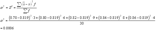 Коэффициент вариации равен 3,053 % , надежен, так как меньше 33%. Анализ: среднеквадратическое отклонение 0,025 или с коэффициентом вариации 3,053% говорит о том, что средняя величина 0,819 в ряду распределения типичная и надежная, а сама совокупность однородна. Из оценочной шкалы колеблемости признака видно, что в данной задаче незначительная колеблемость показателя в ряду распределения,т. к.: