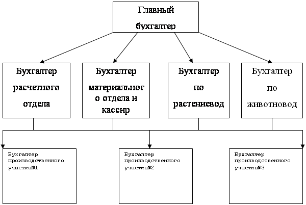 Рисунок 1- Схема бухгалтерского учета по журнально-ордерной форме Структура аппарата бухгалтерии СПК- кооператива «Нива» представляет: главный бухгалтер, бухгалтер расчетного отдела, бухгалтер материального отдела и кассир, бухгалтер по растениеводства, бухгалтер по животноводству, бухгалтера производственных участков.