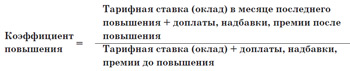Нужно отметить, что постановлением Правительства РФ от 11.11.2009 № 916 в этот пункт внесены изменения, которые необходимо учесть при проведении расчетов. В новой редакции абзаца 5 пункта 16 Положения говорится, что в случае, если при повышении тарифных ставок (окладов) изменяются перечень ежемесячных выплат к ним (премий, доплат, надбавок, рассчитываемых от оклада) и (или) их размеры, средний заработок повышается на коэффициенты, которые рассчитываются путем деления вновь установленных тарифных ставок (окладов) и ежемесячных выплат в месяце последнего повышения на ранее установленные тарифные ставки (оклады) и ежемесячные выплаты. То есть формула дополняется новыми показателями и выглядит следующим образом: