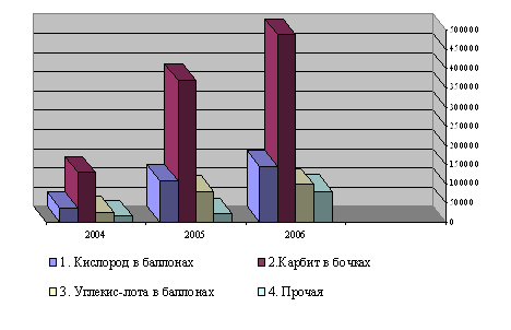 Из рисунка 1 и таблицы 3 видно, что удельный вес реализации кислорода в баллонах в структуре товарной продукции в 2004 году составлял 61,7%, уменьшившись в 2005 году до 64,1% и в 2006 году до 60%. Зато наблюдается увеличение прочей продукции, если в 2004 году их удельный вес составлял 7,4% то в 2006 году 10%. В то же время в ТОО «Арай» за 2006 год реализовало кислород в баллонах на сумму 488436,1 тыс. тенге, что на 31,6% больше показателя 2005 года, а показатель 2005 года в свою очередь больше 2004 года на 184,6%. Удельный вес реализации углекислоты в баллонах в структуре товарной продукции в 2004 году составил 12,6%, в 2005 году 13,7% и в 2006 году 12%. Карбита в бочках составило 18%, 18,5% и 18,3% соответственно. Из данной таблицы также видно, что реализация кислорода в баллонах, карбида в бочках и углекислоты в баллонах составляют наибольший удельный вес в структуре товарной продукции, так в 2006 году 90%, в 2005 году 96,3% и в 2004 году 92,6%. 2.2 Анализ состава и структуры затрат на производство продукцииВ ТОО «Арай» затраты на производство и реализацию кислорода и сопутствующей продукции можно разделить по следующим статьям: расходы по реализации товаров (работ и услуг); общие и административные расходы; расходы по процентам. В таблице 4 представлены данные по расходам и доходам ТОО «Арай» за 2005–2006 годы. Согласно таблицы 4 в 2006 году доход ТОО «Арай» от реализации товаров (работ и услуг) увеличился на 235318 тыс. тенге по сравнению с 2005 годом, а их себестоимость на 134447 тенге. Валовый доход 2006 года составил 212319 тыс. тенге, что на 100871 тыс. тенге больше суммы 2005 года, в итоге чистый доход 2006 года увеличился на 89588 тыс. тенге показателя 2005 года составив 181670 тыс. тенге. Таблица 4. Расходы и доходы ТОО «Арай» за 2005–2006 гг. тыс. тенге