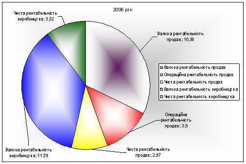 Відповідно таблиці 4.1, всі розрахунки рентабельності, а також їх динаміка має позитивні показники. Це означає, що підприємство веде правильну політику ціноутворення, розширює ринки збуту, нарощує обсяги виробництва, розширює асортимент виробленої продукції а) рентабельність за 2006 рік