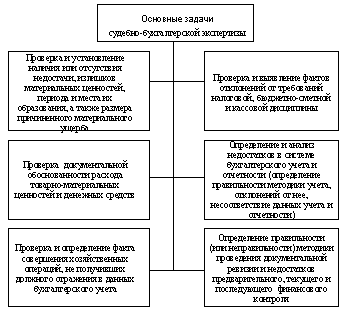 Рис.2. Основные задачи судебно-бухгалтерской экспертизы. При определении суммы недостачи или излишков часто исследуют также хозяйственные операции, не получившие должного отражения в данных учета. Этим определяется взаимосвязь рассмотренной задачи судебно-бухгалтерской экспертизы с двумя другими основными задачами. 2. Проверка и определение документальной обоснованности расходования товарно-материальных ценностей и денежных средств. При решении этой задачи эксперт-бухгалтер устанавливает, имеются ли в данных учета специфические признаки фиктивности операций, отраженных в первичной документации, достаточно ли этих признаков для утверждения о фиктивности операций, и формулирует соответствующий вывод. В других случаях в результате проведенного исследования эксперт-бухгалтер определяет, что операция, действительность которой подверглась сомнению, отвечает требованиям бухгалтерского учета, т.е. имела место и нашла правильное отражение в учетных документах. 3. Проверка и определение факта совершения хозяйственных операций, не получивших должного отражения в данных бухгалтерского учета. Так, эксперт-бухгалтер может установить иногда по взаимосвязанным документам, что со склада определенного предприятия отпущено ценностей больше, чем указано в накладной, или что в торгующую организацию поступили какие-либо товары без оприходования их по товарному отчету либо что взамен товаров, указанных в накладной, отпущены другие ценности, и т.п. Разрешение перечисленных задач помогает следствию и суду установить наличие ущерба, причиненного определенными материально ответственными лицами, период образования и его размер. Однако этим не исчерпываются возможности судебно-бухгалтерской экспертизы. Во многих случаях в злоупотреблениях помимо материально ответственных лиц принимают участие работники учета, а иногда и контрольно-ревизионного аппарата. В таких ситуациях объектом расследования становятся различного рода отклонения от правил учета, контроля, факты несоблюдения налоговой, сметной или кассовой дисциплин, допущенные этими должностными лицами. Определенные недостатки в учете и контроле, факты несоблюдения штатно-финансовой дисциплины и другие явления могут стать объектом расследования или выступать в качестве условий, способствовавших совершению злоупотреблений. Вместе с тем наличие этих недостатков в хозяйственной деятельности предприятий нередко представляется спорным, поэтому для их установления требуется применение специальных знаний эксперта-бухгалтера. Этим определяется содержание других задач, разрешаемых с помощью судебно-бухгалтерской экспертизы. 4. Проверка и выявление фактов отклонений от требований налоговой, бюджетно-сметной или кассовой дисциплины. 5. Определение и анализ недостатков в системе бухгалтерского учета и отчетности (определение правильности или неправильности методики учета, применяемой в данной организации, отклонений от правил ведения учета и отчетности, несоответствия между данными учета и отчетности и др.). 6. Определение правильности (или неправильности) методики проведения документальной ревизии, проверка различного рода недостатков в организации предварительного, текущего и последующего финансового контроля. Решение любой из перечисленных задач требует от