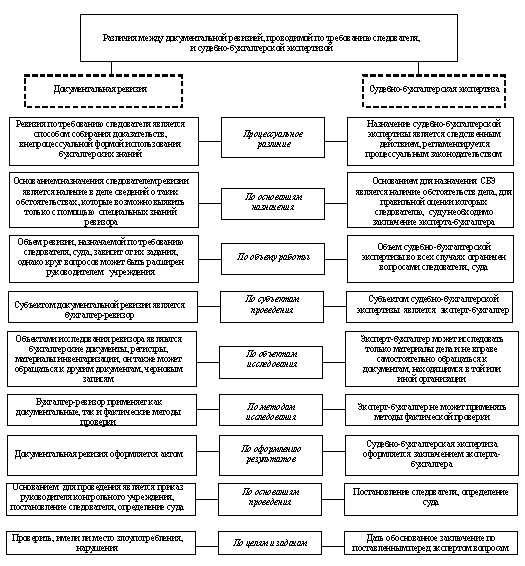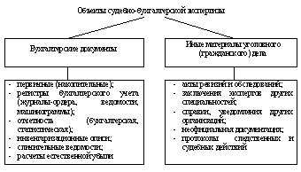 Реферат: Судебно-бухгалтерская экспертизаРеферат: Судебно-бухгалтерская экспертизаСудебно-бухгалтерская экспертиза СОДЕРЖАНИЕ 1. Понятие, сущность и задачи судебно-бухгалтерской экспертизы 2. Предмет, объекты исследования и методы судебно-бухгалтерской экспертизы 3. Процессуальные права, обязанности и ответственность эксперта-бухгалтера 4. Отличия судебно-бухгалтерской экспертизы от ревизии Список использованных источников 1. Понятие, сущность и задачи судебно-бухгалтерской экспертизы Деятельность органов предварительного следствия и суда направлена на установление истины по делу при помощи доказательств. В соответствии со ст. 88 УПК Республики Беларусь «доказательствами являются любые фактические данные, полученные в предусмотренном законом порядке, на основе которых орган, ведущий уголовный процесс, устанавливает наличие или отсутствие общественно опасного деяния, предусмотренного уголовным законом, виновность лица, совершившего это деяние, либо его невиновность и иные обстоятельства, имеющие значение для правильного разрешения уголовного дела. Источниками доказательств являются показания подозреваемого, обвиняемого, потерпевшего, свидетеля, заключения эксперта…». Экспертиза – это исследование и решение опытными специалистами вопросов, требующих специальных знаний в области науки, техники, экономики, искусства или других отраслей знаний. Судебная экспертиза – исследование, проводимое экспертом в порядке, предусмотренном процессуальным законодательством, для установления по материалам уголовного, гражданского или арбитражного дела фактических данных и обстоятельств. Судебная экспертиза является сложным, единственным следственным действием, подготовительный и заключительный этапы которого осуществляют работники правоохранительных органов, а этап исследования – эксперт. Судебная экспертиза отличается от несудебной тем, что порядок ее назначения, проведения, а также оформления и использования полученных при этом результатов предусмотрен процессуальным законодательством. В законе специально определены основания и условия назначения судебной экспертизы, порядок ее проведения; устанавливаются принципы оценки и использования заключения эксперта как доказательства по делу; определены права и обязанности участников конституционного, уголовного, гражданского, арбитражного, налогового и административного процессов при проведении судебных экспертиз. Проведение экспертизы – это процессуальное действие, которое состоит в исследовании экспертом по заданию правоохранительных органов вещественных доказательств и других материалов в целях установления фактического состояния и обстоятельств, имеющих существенное значение для правильного решения по существу рассматриваемого дела. Экспертизы классифицируются по организационным, процессуальным (предметным) признакам и видам (рис.1). По организационным признакам они делятся на первичные, назначаемые по конкретному делу впервые, и повторные, назначаемые по одному и тому же делу повторно. Повторная экспертиза назначается в случае, если в заключении эксперта нет достаточно полных ответов на вопросы, поставленные органами суда и следствия. Дополнительной является экспертиза, которая назначается в зависимости от ситуации, возникшей в ход