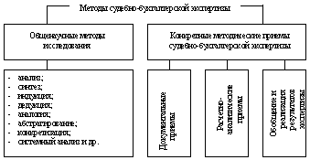 Рис. 3. Объекты судебно-бухгалтерской экспертизы. К бухгалтерским документам относится вся документация, в которой отражается финансово-хозяйственная деятельность предприятия: первичные, накопительные и сводные бухгалтерские документы; учетные регистры (журналы-ордера, ведомости, машинограммы, мемориальные ордера и т.п.); отчетность (балансы с приложениями, статистические отчеты); инвентаризационные описи и сличительные ведомости; расчеты естественной убыли. К другим материалам дела относятся: акты ревизий и обследований, справки, выписки и уведомления различных организаций, неофициальная документация, протоколы следственных и судебных действий, заключения экспертов других специальностей. Правильное использование других материалов дела помогает эксперту выяснить обстоятельства, связанные с процессом оформления учетных документов, их назначением, условиями, при которых они были составлены, с этапами прохождения документов и совершенными на их основе действиями. Порядок и пределы использования экспертом-бухгалтером материалов первой и второй групп различны. Выводы эксперта должны быть обоснованы бухгалтерскими источниками. Иные материалы дела могут быть использованы экспертом для более точного определения периода исследования, выбора методов экспертизы и решения других вспомогательных и организационных вопросов. Метод судебно-бухгалтерской экспертизы – это совокупность методических приемов, применяемых при экспертном исследовании хозяйственных операций, отраженных в бухгалтерском учете, результатах ревизий и проверок финансовой деятельности хозяйствующих субъектов (рис. 4). Общенаучные методы исследования в судебно-бухгалтерской экспертизе включают в себя, прежде всего, анализ и синтез, абстрагирование и конкретизацию, индукцию и дедукцию, аналогию и моделирование, системный анализ и другие методы исследования окружающей действительности.