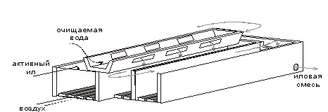 Рис.2. Аэротенк-смеситель Аэротенки-вытеснители. В отличие от аэротенков других типов (аэротенков-смесителей и аэротенков промежуточного типа), аэротенки-вытеснители представляют собой сооружения, в которых очищаемая сточная вода постепенно перемещается от места впуска к месту ее выпуска. При этом практически не происходит активного перемешивания поступающей сточной воды с ранее поступившей. Процессы, протекающие в этих сооружениях, характеризуются переменной скоростью реакции, поскольку концентрация органических загрязнений уменьшается по ходу движения воды. Аэротенки-вытеснители весьма чувствительны к изменению концентрации органических веществ в поступающей воде, особенно к залповым поступлениям со сточными водами токсических веществ, поэтому такие сооружения рекомендуется применять для очистки городских и близких по составу к бытовым промышленных сточных вод.