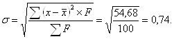 Расчет среднего квадратического отклонения показывает, что отклонение балла от средней арифметической составляет в среднем около 0,74 балла. Находим коэффициент вариации по формуле: