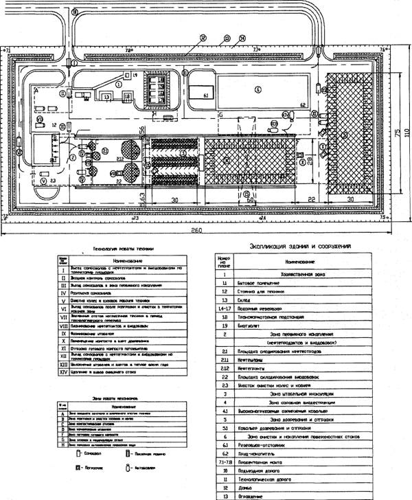 Рис. 3 Для ускорения обработки кислых шламов авторами предложено использовать добавки на основе щелочных шламов химводоочистки и шлаков ТЭЦ НПЗ, пригодных в качестве корректоров реакции среды (Пат. 2250146 РФ). Один из способов интенсификации биотермической обработки — управление аэрацией, размерами и формой штабелей компоста в зависимости от стадийности процесса. Например, на фазе роста температур с одновременной инокуляцией смеси стартовыми дозами адаптированной микрофлоры аэрация должна осуществляться в непрерывном режиме, а толщина слоя компоста, подвергаемого продувке, должна быть не более 1,5 — 2 м. После подъема температуры выше 50°С смесь из инокулируемых штабелей перемещают в высоконагружаемый кавальер высотой до 6 — 8 м, а аэрацию проводят периодически, контролируя динамику термогенеза и степень распада углеводородов. На этой фазе можно использовать компостируемый материал для производства экранов биологической рекультивации полигонов. С выходом компостируемой смеси на стадию медленного падения температуры полученный компост переносят в бурт дозревания и гуммификации. Полученный рекультивационный материал можно использовать для заполнения отработанных карьеров, в планировочных работах, а также для технического экранирования заполненных накопителей промышленных отходов на стадии их ликвидации или консервации. Температурно-временная характеристика компостирования нефтешламов с использованием интенсивных технологий представлена на рис. 3. Благодаря внесению инокулирующих и нейтрализующих добавок продолжительность процесса по сравнению с классической схемой оказалась почти в 2 раза меньше и составила 202 сут. вместо одного года (см. рис. 2). Ускорению процесса также способствовало выделение функциональных зон в общей технологической цепочке компостирования нефтешламов (зоны инокуляции, высоких температур, дозревания и гумификации) и дифференцированное управление аэрацией в каждой из них в соответствии с динамикой термогенеза. Выделение при компостировании дифференцированных температурных зон и интенсивное управление процессом в каждой из этих зон стало основой для конструктивно-технологического и функционально-компоновочного оформления сооружений по биодеструкции нефтепродуктов в нефтесодержащих шламах. На рис. 4 представлен комплекс по биодеструкции нефтешламовых отходов, разработанный авторами и успешно внедренный на одном из предприятий Самарской области. Производительность комплекса составляет 10 тыс. т шламов в год, в том числе: нефтешламов и замазученных грунтов — 5 тыс. т; шламов и избыточных активных илов канализационно-очистных сооружений НПЗ — Зтыс.т; по шламам химводоочистки ТЭЦ НПЗ — 2 тыс. т.