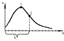 Таким чином імовірність коливається в межах від 0,0 до 1,0. Якщо імовірність події дорівнює нулю, вона абсолютно неможлива, а якщо одиниці то вірогідна. На кривій розподілу (рис. 3) виділяються декілька характерних точок. Так, точка 1 відповідає максимальній частоті повторювань і називається модою. Точка 2 відповідає середньому значенню ряду і називається центром розподілу. Криві розподілу бувають