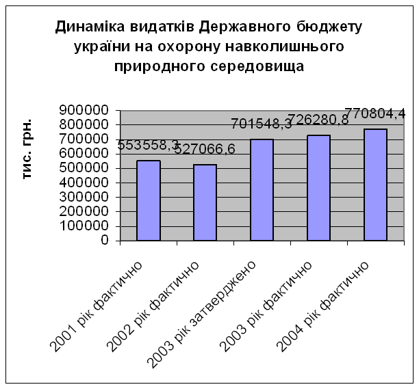 Видатки Державного фонду охорони навколишнього природного середовища, за даними Міністерства фінансів, у 2004 році становили 74430,4 тис. грн. і здійснювалися за 10 бюджетними програмами(Табл. 2.2).[12] Таблиця 2.2Видатки Державного фонду охорони навколишнього природного середовища на 2004 рік (тис. грн.)