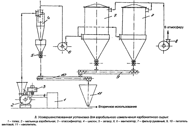 Длительная промышленная эксплуатация установки в различных аэродинамических и температурных диапазонах показала, что работа измельчителя в режиме 1 является наиболее приемлемой для заводских условий и позволяет получать заданные технологическим регламентом характеристики сырья. Для компонентов с твердостью 3-5 ед. по шкале Мооса на базе ударно-отражательного измельчителя разработана технология измельчения карбонатного сырья, предусматривающая ввод в измельчитель ПАВ в количестве 0,03-0,4% с плотностью, промежуточной между насыпной плотностью исходного и насыпной плотностью измельченного сырья. С целью повышения надежности и снижения износа рабочих органов измельчителя на первых двух стадиях в питание дробилки дополнительно вводится измельченный продукт в количестве 7-25%, а на последующих стадиях это количество уменьшается до 1-5%, причем дополнительно вводимый продукт увлажняется до 0,2-3,5% боросодержащим 30-70%-ым раствором или обрабатывается порошкообразным боросодержащим сырьем в количестве 2-7%-ым с удельной поверхностью в 1,1-2,3 раза превышающей удельную поверхность измельченного карбонатного сырья. Дополнительно карбонатное сырье перед измельчением однократно-трехкратно может обрабатываться 7-25%-ым подогретым до 65-95 °С водным раствором А!203 и CaF2, включающим компоненты в следующем соотношении: А1203 - 11-18; CaF2 - 0,5-4 в количестве 0,5-10% от массы сырья, и подвергаться одно-трехкратному охлаждению путем эндотермического удара длительностью 0,5-2,5 мин. На рис. 3 представлена усовершенствованная технологическая схема аэробильного измельчения известняка и доломита, реализованная на заводах стеклянного волокна.