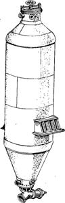 г) газлифтный: 1 – корпус,2 – диффузор, 3 – диспергатор, 4 – воздухораспределитель, 5 – теплообменник, 10. Аппараты для переработки концентрированных гидролизных средГидролизаппарат периодического действия представляет собой вертикальный цилиндр с двумя усеченными конусами (рис. 15). Верхний конус заканчивается загрузочным отверстием, закрываемым крышкой. Нижний конус заканчивается выхлопным устройством для удаления лигнина по окончании варки сырья. В верхней горловине гидролизаппарата имеются штуцера для подвода горячей разбавленной кислоты и сдувки воздуха в начале варки, а также для сброса избыточного давления. В нижнем конусе гидролизаппарата устанавливаются фильтрующие устройства для отделения гидролизата от лигнина. На цилиндрической части гидролизаппарата снаружи приварены опорные лапы, которыми он опирается на несущую конструкцию. Корпус гидролизаппаратов обычно изготовляется сварной, из листовой стали. В последнее время ведутся опыты по применению для этой цели титана. Эта форма гидролизаппарата является наиболее удобной для проведения перколяции. Стальные гидролизаппараты должны быть защищены внутри кислотоупорным слоем от корродирующего действия горячей разбавленной серной кислоты. Футеровка состоит из сплошного слоя бетона с шамотом, примыкающего к стальной стенке. Внутренняя поверхность бетонного слоя толщиной 70—90 мм облицовывается специальными термокислотостойкими керамическими плитками или слоем шамотного кирпича. Плитки и кирпич укрепляются на бетонной подмазке, а швы между ними промазываются андезитовой замазкой^ изготовляемой на жидком стекле, или кислотоупорным цементом с шамотом. Наружная металлическая стенка гидролизаппаратов для предохранения от чрезмерной потери тепла покрывается тепловой изоляцией. В верхней и нижней горловинах гидролизаппаратов, а также в местах установки штуцеров, имеются бронзовые кольца или штуцер, обеспечивающие переход от кислотоупорной внутренней футеровки к верхней и нижней стальной горловине и коммуникациям. Внутренняя поверхность крышек также покрыта кислотоупорным слоем бронзы или латуни. Кислотостойкость медных сплавов и красной меди в условиях гидролиза усиливается благодаря образованию тонкого слоя смолистого вещества, выделяющегося из гидролизата во время варки. Благодаря наличию этого слоя коррозия поверхности меди и ее сплавов уменьшается почти в 2 раза.