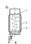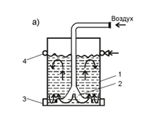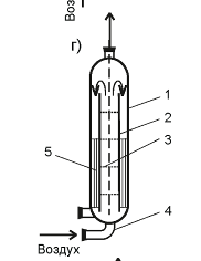 Рис. 1,6 Ферментеры с подводом энергии газовой фазой (группа ФГ) (Виестур и др., 1986). а) барботажный: 1 – корпус, 2 – воздухораспределитель, 3 – карман, 4 коллектор. 5. Общая характеристика реакторов с подводом энергии через жидкостьФерментеры с вводом энергии жидкой фазой (группа ФЖ) наиболее сложны по конструкции и энергоемки, но обеспечивают наиболее высокие по сравнению с группой ферментеров ГФ значения коэффициента массопередачи кислорода, свыше 6 кг/м3 ч. В данных аппаратах ввод энергии осуществляется жидкой фазой, обычно самовсасывающими мешалками или насосами; в последнем варианте жидкость вводится в аппарат через специальное устройство (сопло, эжектор, диспергатор). Данные аппараты также можно подразделит на ряд типов (рис. 1.7): ферментеры с самовсасывающими мешалками не требуют специальных воздуходувных машин, так как поступление в них воздуха происходит в результате разрежения в воздушной камере мешалки, соединенной с воздуховодом и с жидкостью, отбрасываемой лопатками мешалки; в эжекционных ферментерах возможна рециркуляция газовой фазы, что экономит субстрат, однако требуется наличие специальных насосов для перекачки газосодержащей культуральной среды. Применение эжекционного ввода газовых субстратов в ферментер может интенсифицировать массообмен на порядок; струйные ферментеры (с затопленной или падающей струей) оборудуются мощными насосами, которые забирают культуральную жидкость из нижней части аппарата и через напорный трубопровод подводят поток к аэрирующему устройству (по типу шахтного перепада или напорно-струйные). Струя жидкости под давлением свободно падает сверху и пронизывает аэрируемую жидкость до дна аппарата. Происходят интенсивные турбулизация и перемешивание жидкости. Внизу жидкость вновь засасывается насосом и снова подается вверх аппарата, то есть возникает замкнутый контур циркуляции. Недостатком данных аппаратов являются потери энергии при перекачке жидкости, трудности проектирования в связи с отсутствием надежных методик расчета конструкций и режимов работы струйных и эжекционных устройств.