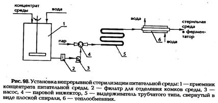 При непрерывном способе стерилизации каждый элементарный процесс — нагрев, выдержка, охлаждение осуществляется в специально предназначенных для этого аппаратах: нагревателе, выдерживателе, теплообменнике, которые со ставляют систему аппаратов для непрерывной стерилизации — установку непрерывной стерилизации (УНС). Непрерывная стерилизация имеет следующие преимущества по сравнению с периодической: 1) при непрерывном методе стерилизации каждый элементарный объем среды (бесконечно малый объем, содержащий одну спору) находится при высокой температуре короткое время; 2) благодаря более высоким температурам стерилизации и короткой экспозиции деструкция компонентов питательной среды минимальна; 3) процесс стерилизации всего объема питательной среды растянут во времени, этим обеспечивается более равномерная загрузка котельной; 4) процесс легко контролируем и управляем; 5) возможна частичная регенерация тепла. Холодная стерилизация осуществляется в отношении некоторых жидкостей, растворы которых нельзя стерилизовать при высоких температурах, так как при этом происходит их испарение или инактивация витаминов и других биологически активных соединений, разложение лекарственных веществ, карамелизация сахаров, денатурация белков и т.п. В этих случаях осуществляют «холодную» С., при которой жидкости фильтруют через мелкопористые бактериальные фильтры. Стерилизация фильтрованием показана для синтетических сред определенного состава, содержащих термолабильные аминокислоты, витамины, белки, для антибиотиков, ароматических углеводородов. Фильтрование проводится через мелкопористые материалы, которые адсорбируют клетки микроорганизмов: каолин, асбест, фарфор и др. Диски, изготовленные из асбеста с целлюлозой называют фильтрами Зейтца. Их помещают в специальный фильтродержатель и стерилизуют в автоклаве, а затем, смонтировав держатель с колбой или бутылью, под давлением пропускают стерилизуемый раствор. Широкое применение нашли мембранные фильтры. Их изготавливают из специально обработанной нитроцеллюлозы. Фильтры имеют поры размером от 0,22 до 100 мм. В фильтродержатели монтируют фильтры с разной величиной пор, от больших к меньшим и при фильтрации растворов постепенно «отсеивают» микроорганизмы различных размеров. Наиболее широко известны фильтрующие пластины фирм «Миллипор», «Синпор», «Владипор». После стерилизующей фильтрации среды и растворы обязательно проверяют на стерильность, помещая микропробы простерилизованных растворов в термостат при температуре 37 ° С. 18. Аппаратура и способы стерилизации воздуха Для стерилизации воздуха в микробиологической промышленности используют стеклянную и простую вату, ткань Петриянова, базальтовое волокно или фильтры из активного угля. Иногда для стерилизации воздуха применяют комбинирование термической обработки, фильтрации и ультрафиолетового облучения. Для очистки воздуха от микрофлоры можно использовать аппараты типа скрубберов, в которых сверху разбрызгивается дезинфицирующее вещество—10%-ная гидроокись натрия или 15—20%-ный раствор серной кислоты. В этих аппаратах нельзя применять такие дезинфицирующие вещества, которые, попадая с потоком воздуха в ферментатор, помешали бы процессу биосинтеза. Для обеспечения кислородом культуры микроорганизмов в усл