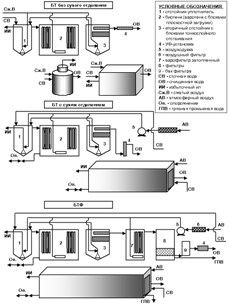 Если vlag > 0,05 м/с, то b 1 = 7. Для повышения глубины очистки воды до БПКполн 3 мг/л и снижения содержания в ней биогенных элементов (азота и фосфора) рекомендуется применение в пруде высшей водной растительности-камыша, рогоза, тростника и др. Высшая водная растительность должна быть размешена в последней секции пруда. Площадь, занимаемую высшей водной растительностью, допускается определять по нагрузке, составляющей 10 000 м3/сут на 1 га при плотности посадки 150-200 растений на 1 м2. 12. Очистка сточных вод в аэротенкахБиотенк (Б.)– аэротенк с насадкой, изготовляемой в виде кассет или блоков из жестких элементов или гибких рулонных материалов. Кассеты или блоки заполняют кольцами, кусками пеноматериалов (пемза, пеностекло, и т.п.), гофрированными листами или сетками из пластмассы или волокнистых материалов. Насадка позволяет увеличить концентрацию ила в Б. за счет закрепления микроорганизмов на ней. С увеличением концентрации ила возрастает пропускная способность Б., которая в обычных условиях лимитируется работой вторичных отстойников, не способных разделить иловые смеси при концентрации свыше 4—6 г/л. При использовании в качестве насадки насыпных и волокнистых материалов (например, в виде ершей) необходима их периодическая регенерация от чрезмерного накопления биомассы путем интенсивной аэрации. Установки БТ (БТФ) предназначены для очистки бытовых и близких к ним по составу производственных сточных вод объемом 25-3000 м3/сутки от органических веществ, взвешенных веществ, азота, фосфора и ряда других примесей с УФ-обеззараживанием очищенных стоков. Установки БТ работают по принципу биотенка-отстойника в режиме денитрификации и биологической детофосфотации с усреднением расхода стоков за счет специальной конструкции лотка осветленной воды. Предварительная механическая очистка сточных вод, уплотнение и стабилизация осадка совмещены в одной зоне из которой избыточный ил периодически откачивается эрлифтом. Одним из наиболее распространенных биоокислителей для очистки производственных сточных вод является аэротенк. Небольшие предприятия пищевой промышленности часто используют в качестве биоокислителя очистную компактную биоустановку КУ-200 производительностью до 200 м3 в сутки с пневмоподачей сжатого воздуха. Установка состоит из трёх частей: аэротенка, где происходит деструкция органических загрязнений, отстойной части, где осветляется очищенный промсток и оседает активный ил, и стабилизатора избыточного активного ила. Наличие биоконтактных элементов в биотенке позволяет снизить потребность в сжатом воздухе и, следовательно, электроэнергии втрое, а также значительно уменьшить период аэрации сточных вод в аэротенке. Особенность биотенков нового типа позволяет рекомендовать их для очистки концентрированных по органическим загрязнениям промстоков различных пищевых производств и агропромышленных комплексов. Они могут быть использованы также для интенсификации работы существующих очистных сооружений. В первой зоне происходит механическая очистка стоков от песка и грубодисперсных взвешенных веществ, анаэробная предотчистка от органических веществ, а также уплотнение и сбраживание осадка в анаэробно-аэробном режиме. Первая зона оборудована эрлифтом избыточного ила. Во второй зоне, оборудованной системой мелкопузы