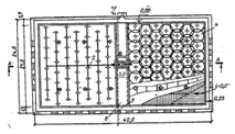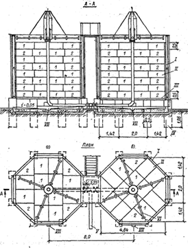 Рис. 5.9. Биофильтр с пластмассовой загрузкой производительностью 1400 м3/сут: I — корпус из стеклопластика по металлическому каркасу; II — пластмассовая загрузка; III — решетка; IV — бетонные столбовые опоры; V — подводящий трубопровод; VI— реактивный ороситель; VII — отводящие лотки; а и б — раскладка блоков соответственно в четных и нечетных рядах. Анаэробные биофильтры. Эта новая разновидность биофильтров представляет собой закрытые резервуары с загрузкой, сквозь которую вода профильтровывается восходящим потоком, без доступа в нее кислорода воздуха. Анаэробные биофильтры по принципу работы занимают промежуточное положение между обычными биофильтрами и метантенками. Биопленка в них закреплена на материале загрузки; процессы окисления сопровождаются метанообразованием. Анаэробные биофильтры можно применять для очистки высококонцентрированных сточных вод, не содержащих взвешенных веществ или содержащих их в незначительном количестве. Расчет биофильтров. В основу расчета капельных и высоконагружаемых биофильтров положено представление о том, что снижение концентрации загрязнений, описываемых величиной БПК, может быть принято по типу уравнения реакции первого порядка: