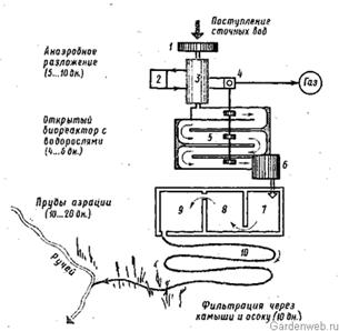 Рис. 1. Схема биологической обработки стоков: 1 — механический фильтр; 2 — солнечный коллектор для подогрева воды; 3 — биореактор; 4 — компрессор для сжатия биогаза; 5 — каналы выращивания водорослей; 6 — фильтр для сбора водорослей; 7…9 — аэробные пруды; 10 — ручей проложенный через осоковый луг При очистке в биологических прудах сточные воды не должны иметь БПКполн свыше 200 мг/л-для прудов с естественной аэрацией и свыше 500 мг/л-для прудов с искусственной аэрацией. При БПКполн свыше 500 мг/л следует предусматривать предварительную очистку сточных вод. В пруды для глубокой очистки допускается направлять сточную воду после биологической или физико-химической очистки с БПКполн не более 25 мг/л-для прудов с естественной аэрацией и не более 50 мг/л-для прудов с искусственной аэрацией. Перед прудами для очистки надлежит предусматривать решетки с прозорами не более 16 мм и отстаивание сточных вод в течение не менее 30 мин. После прудов с искусственной аэрацией необходимо предусматривать отстаивание очищенной воды в течение 2-2,5 ч. Отношение длины к ширине пруда с естественной аэрацией должно быть не менее 20. При меньших отношениях надлежит предусматривать конструкции впускных и выпускных устройств, обеспечивающие движение воды по всему живому сечению пруда. В прудах с искусственной аэрацией отношение сторон секций может быть любым, при этом аэрирующие устройства должны обеспечивать движение воды в любой точке пруда со скоростью не менее 0,05 м/с. Форма прудов в плане зависит от типа аэраторов: для пневматических или механических прудов могут быть прямоугольными, для самодвижущихся механических-круглыми. Отметка лотка перепускной трубы из одной ступени в другую должна быть выше дна на 0,3-0,5 м. Выпуск очищенной воды следует осуществлять через сборное устройство, расположенное ниже уровня воды на 0,15-0,2 глубины пруда. Хлорировать воду следует, как правило, после прудов. В отдельных случаях (при длине прокладки трубопровода хлорной воды свыше 500 м или необходимости строительства отдельной хлораторной и т. п.) допускается хлорирование перед прудами. Концентрация остаточного хлора в воде после контакта не должна превышать 0,25-0,5 г/м3. Количество осадка, выпадающего в контактных резервуарах, следует принимать, л на 1 м3 сточной воды, при влажности 98 %: после биологической очистки в аэротенках и на биофильтрах-0,5. РасчетРабочий объем пруда надлежит определять по времени пребывания в нем среднесуточного расхода сточных вод. Время пребывания воды в пруде с естественной аэрацией tlag , сут, следует определять по формуле