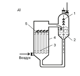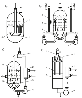 Рис. 1.7. Ферментеры с вводом энергии жидкой фазой (группа ЖФ) (Виестур и др. 1986). а) – с самовсасывающей мешалкой: 1 – корпус, 2 – мешалка, 3 – циркуляционный контур-теплообменник, б) – эжекционный: 1 – корпус, 2 – насос, 3 – эжектор, в) – струйный с затопленной струей: 1 – эжектор, 2 – теплообменник, 3 – корпус, 4 – насос, 5 – рассекатель, 6 – труба с насадкой, г) – струйный с плавающей струей: 1 – теплообменник, 2 – насос, 3 – корпус, 4 – эжектор. 6. Общая характеристика реакторов с комбинированным подводом энергии Третья группа аппаратов – с подводом энергии газовой и жидкой фазами (группа ФЖГ). Основными их конструкционными элементами являются перемешивающие устройства всех известных типов, а также наличие в совокупности насосов и перемешивающих устройств. Это могут быть аппараты с группой самовсасывающих мешалок и насосом для перекачивания культуральной жидкости и другие сочетания перемешивающих и аэрирующих устройств. Коэффициент массопереноса кислорода в таких ферментерах может в принципе иметь любые из известных значения. Выращивание дрожжей осуществляют в аппаратах эрлифтного типа объемом от 300 до 600 м3 с вводом воздуха в нижнюю зону аппарата при избыточном давлении 40–60 КПа. В процессе насыщения питательной среды воздухом образуется газо-жидкостная эмульсия, циркулирующая по всему объему аппарата, обеспечивающая эффективное перемешивание среды. Для борьбы с образующейся при аэрации пеной используют механическое пеногашение. Рабочий объем аппарата составляет около 70 % от общего объема. На отдельных предприятиях применяют также барботажноэрлифтные ферментеры большего объема, до 1300 м3 с воздухораспределением по нескольким, обычно 4–5 зонам. 7. Возможности аппаратов колонного типа по выбору и оптимизации режимов ферментации.Барботажно-колонный – в нижней части корпуса такого аппарата устанавливается перфорированная пластина с диаметром отверстий 0.0005 м или сопловой эжектор с диаметром сопла 0.004 м; барботажно-эрлифтный аппарат характеризуется наличием внутри одного или нескольких диффуров («стаканов») или нескольких перегородок для принудительного разделения восходящих и нисходящих потоков циркулирующей жидкости; эти элементы расположены равномерно по сечению аппарата или концентрично:
