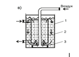 2. Основные отличия процессов и аппаратов БТ от процессов и аппаратов химтехнологииПринципиальное отличие биотехнологических процессов от чисто химических заключается в следующем: – чувствительность биологических агентов к физико-механическим воздействиям; – наличие межфазового переноса веществ (по типу «жидкость – клетки», «газ – жидкость – клетки»); – требования условий асептики; – низкие скорости протекания многих процессов в целом; – нестабильность целевых продуктов; – пенообразование; – сложность механизмов регуляции роста и биосинтеза. 3. Классификация реакторов по конструктивным признакам и по организации перемешиванияАппараты для аэробной глубинной ферментации наиболее сложны как конструкционно, так и с точки зрения их эксплуатации. Главная задача, возникающая при их конструировании, – обеспечение высокой интенсивности массо- и энергообмена клеток со средой. Массообмен определяется транспортом (переносом) кислорода и других биогенных элементов из среды в микробную клетку и отводом из нее продуктов обмена. Главным показателем массообменных характеристик ферментера служит коэффи-циент массопередачи кислорода, так как кислород является основным лимитирующим фактором аэробных ферментационных процессов. Расход кислорода на образование 1 кг биомассы в зависимости от типа углеродсодержащего сырья и степени его восстановленности может составлять от 0.75 до 5.00 кг. Клетки способны утилизировать кислород только в растворенном виде, поэтому необходимо постоянно поддерживать его концентрацию в культуре на уровне, оптимальном для конкретного продуцента. При этом скорость поступления кислорода к клеткам должна превышать скорость его включения в клетки, и в околоклеточном пространстве не должно возникать так называемых «концентрационных ям». Кроме этого, концентрация клеток и растворенного субстрата должны быть равномерными по всему объему ферментера. Поэтому перемешивание является также одним из основных факторов, обеспечивающих требуемую гидродинамическую обстановку в аппарате. При интенсивном перемешивании пузырьки воздуха дробятся в аппарате и диспергируясь увеличивают площадь контакта фаз «среда-клетка». Однако чрезмерное перемешивание может вызвать механическое повреждение биологических объектов. К настоящему времени разработано и применяется огромное количество разнообразнейших перемешивающих и аэрирующих устройств, и классифицировать их практически невозможно. 4. Характеристика аппаратов с подводом энергии через газовую фазуФерментеры с подводом энергии к газовой фазе (группа ФГ). Их общий признак – подвод энергии в аппарат через газовую фазу, которая является ее носителем. Ферментеры характеризуются достаточно простой конструкцией (отсутствуют трущиеся, движущиеся узлы), высокой эксплуатационной надежностью, но имеют не очень высокие массообменные характеристики (коэффициент массопередачи кислорода менее 4 кг/м3) (рис. 1). Данные аппараты представляют собой вертикальную емкость, снабженную газораспределительным устройством одного из известных типов. Барботажные газораспределительные устройства обычно устанавливаются в нижней части аппарата. Подаваемый сверху через распределительную трубу воздух, пройдя через барботер, насыщает кислородом толщу среды. Коэффициент ма