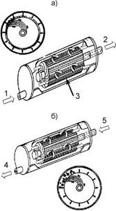 Рис. 1. Ультрафильтрационный модуль а - рабочий режим; б - режим промывки; 1 - исходная вода; 2 - фильтрат; 3 - рулонный элемент; 4 - сброс концентрата; 5 - обратная промывка фильтратом В процессе длительной работы производительность мембранных аппаратов постепенно уменьшается, так как на турбулизаторной сетке, на поверхности и на стенках пор мембран сорбируются различные вещества и отлагаются частички загрязнений, увеличивающие общее гидравлическое сопротивление мембранных аппаратов. Для восстановления первоначальной производительности несколько раз в год проводится химическая промывка мембранных аппаратов специальными кислотными и щелочными реагентами для удаления накопленных загрязнений. При конструировании систем очистки воды на основе метода ультрафильтрации основной задачей, встающей перед проектировщиком, является правильное определение продолжительности прямого фильтрования, а также частоты и интенсивности обратных промывок. Эти параметры зависят от качества исходной воды и определяются исходя из оптимальных соотношений производительности ультрафильтрационной установки и ее общего водопотребления [3]. Правильный выбор режима промывки обеспечивает эффективную работу установки, заключающуюся в длительном сохранении производительности и качества фильтрата. Авторами на примере обезжелезивания подземной воды была разработана методика поиска оптимальных параметров работы ультрафильтрационной установки. Эффективность обратной промывки зависит от ее интенсивности (при неизменном давлении промывки можно оперировать длительностью обратной промывки) τ и интервала между промывками (продолжительность фильтроцикла) t. При заданном времени τ эффективность работы установки зависит от продолжительности t: чем меньше t, тем эффективнее проходит отмывка мембраны от загрязнений, но тем больше образуется промывной воды. Исследования по оптимизации процесса обратной промывки ставят целью определить такие значения τ и t для различного состава обрабатываемой воды, которые соответствуют наибольшему количеству очищенной воды, полученной в течение времени Т. Исследования проводились на модельных растворах хлорида железа (III) на ультрафильтрационных мембранах марки УАМ-150. На рис. 2 показано снижение производительности мембранного аппарата с течением времени для разных концентраций железа в исходной воде.