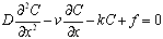 Тут c – концентація, t - час, x,y,z – координати (вісь x напрямлена вздовж потоку), Dx,Dy,Dz – коефіцієнти молекулярно-турбулентної дифузії, vx,vy,vz - складові швидкості потоку рідини, k – коефіцієнт самоочистки, f – функція подачі забруднення. Дво- і тривимірні рівняння, як правило, не мають аналітичного розв'язку і їх розв'язують чисельними методами з застосуванням ЕОМ. Для водотоків звичайно використовується одномірне рівняння поздовжньої дисперсії, що отримується з тривимірного рівняння турбулентної дифузії усередненням його по живому перерізу потоку. Цей випадок має місце для нешироких водойм, якщо ігнорувати процеси самоочищення. Рівняння набирає вигляду:
