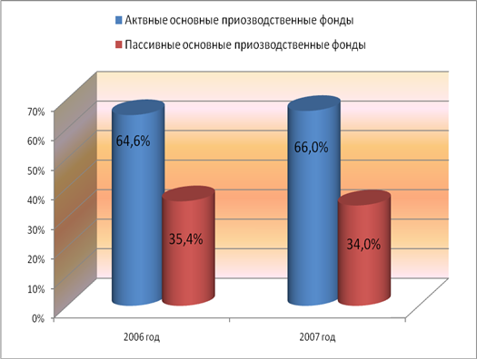Рис. 2.1.2 Структура основных производственных фондов ОАО «Северный порт» в 2007 году Анализируя структуру основных производственных фондов порта, видим, что несмотря на то, что стоимость зданий и сооружений за рассматриваемый период не изменилась, их удельный вес в общей стоимости основных производственных фондов снизился на 0,35% и 1,01% соответственно. В то же время доля групп «Машины и оборудование» и «Транспортные средства» увеличилась в 2007 году по сравнению с 2006 годом на 1,17% и на 0,19% соответственно. Незначительные изменения удельного веса отдельных групп основных производственных фондов в их общей стоимости не оказали существенного влияния на структуру основных производственных фондов ОАО «Северный порт» и она остаётся относительно стабильной. Наибольший удельный вес приходится на группу «Машины и оборудование» - 47– 48%, а так же на группу «Сооружения и передаточные устройства» - 25 – 26%. Наименьший удельный вес имеет группа «Здания» - около 9%. Основные производственные фонды играют в процессе производства неодинаковую роль. В зависимости от степени участия в производственном процессе в их составе выделяют активную и пассивную части. При этом на соотношение активной и пассивной частей существенное воздействие оказывает специфика отрасли. Так на внутреннем водном транспорте ведущая роль принадлежит активно действующим основным производственным фондам (флот, перегрузочные машины и оборудование), которые непосредственно участвуют в процессе производства и служат базой для оценки технического уровня предприятий и их производственных мощностей. В состав активной части основных производственных фондов ОАО «Северный порт» входят портовые краны, краны мостовые, краны консольные, автопогрузчики, грейферы, бульдозеры, виброплощадки, плавучие пожарные установки, теплоходы и др. Основные производственные фонды, которые непосредственно не участвуют в переработке сырья, полуфабрикатов, то есть не воздействуют на предметы труда, а лишь создают условия для нормального хода производства, называются пассивными. На внутреннем водном транспорте к ним относятся причалы, портовые склады, гидротехнические сооружения и пр. В ОАО «Северный порт» это ангары и грузовые склады, здания цехов и станций, водоводы, линии связи, подъездные и подкрановые пути, причальные стенки, очистительные сооружения и пр. Деление основных производственных фондов на активные и пассивные во многом определяется отраслевыми особенностями производства. Соотношение активной и пассивной частей основных производственных фондов ОАО «Северный порт» представлено на рисунке 2.1.3.