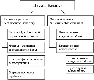 Рис.1.2 Структура активности баланса Пассив балансаПассив баланса (рис. 1.2) отражает источники финансирования средств предприятия, сгруппированные на определенную дату по их принадлежности и назначению. Пассив показывает: - величину средств (капитала), вложенных в хозяйственную деятельность предприятия; - степень участия в создании имущества организации. Для аналитических исследований и оценки структуры все обязательства группируются по следующим признакам: 1. Юридической принадлежности: - обязательства перед собственниками (собственный капитал); - обязательства перед третьими лицами — кредиторами, банками и т.п. (заемный капитал). 2. Срочности возврата обязательств: - средства длительного пользования; - средства краткосрочного пользования.