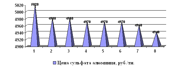 Рис. 5.Цена сульфата алюминия за 1 тонну (руб.) 1. ООО «Реахим – Самара» (Самара); 2. ООО «Химком – Свет» (СПб.); 3. ООО «Аква-реагент» (Дзержинск); 4. ЗАО «Самарское предприятие Химпром» (Самара); 5. Химический завод им. П.Л. Войкова ОАО «Аурат» (Москва); 6. ДП «Завод "Коагулянт"» (Украина); 7. ОАО «Пигмент» (СПб.); 8. АО «Белакватрейд-сервис» (Белоруссия) Снижение закупочной цены на 40 руб. / тонну при сохранении ООО «Водоканал-сервис» отпускной цены неизменной теоретически способно принести предприятию дополнительно 580 тыс. руб. валовой прибыли ежегодно. Однако при этом необходимо учитывать, что в случае переориентации предприятия на сотрудничество с белорусскими поставщиками у ООО «Водоканал-сервис» во-первых, существенно возрастут транспортные издержки, а во-вторых, повысится риск поставок (поскольку товар будет поступать из-за рубежа, возможные различные накладки в связи с изменениями таможенных режимов и т.д.). В этой связи возможность заключения договоров с зарубежными поставщиками должна быть пристально рассмотрена финансово-экономическими службами предприятия с точки зрения введения в договор условий, минимизирующих риски ООО «Водоканал-сервис». (в) еще одним существенным резервом повышения прибыли предприятия является возможность выведения ООО «Водоканал-сервис» на рынок химических реактивов принципиально нового высокотехнологичного и экологически эффективного коагулянта титана. Данный реактив был разработан еще в середине 90-х годов Санкт-Петербургским Научно-исследовательским центром экологической безопасности РАН (НИЦЭБ РАН). По сравнению с используемым ныне сульфатом алюминия (в настоящее время на территории России в водоочистке практически используется только он), титановый коагулянт обладает целым рядом преимуществ. Применение титанового реагента при очистке различных водных объектов (реки, озера, подземные воды) показало его несомненное преимущество по сравнению со всеми известными реагентами. Это преимущество состоит, прежде всего, в том, что нет необходимости во введении дополнительных реагентов (щелочи, флокулянтов) для повышения качества очистки воды, и резко, в 10 раз или более, сокращается расход хлора. Очистка от тяжелых металлов при применении титанового коагулянта достигает 90–95% (против 60–80% при использовании алюминиевых коагулянтов). Очистка от органических соединений составляет 90–100% (против 60–70%). Очистка от микроорганизмов, бактерий, фито- и зоопланктона достигает 100%. Именно поэтому для обеззараживания воды много хлора и не требуется. Еще одним из преимуществ титанового реагента является способность эффективно очищать воду при низких температурах природной воды. Испытания показали, что при снижении температуры до 4°С интенсивность образования хлопьев практически не снижается. Это его свойство особенно ценно для таких северных стран, как Россия. Особо необходимо отметить низкий уровень вторичного загрязнения компонентами применяемых реагентов. Остаточное содержание ионов титана в очищенной воде даже при передозировке не превышает 0,03 мг/л, в то время как допустимое содержание титана в воде составляет 0,1 мг/л (в 30 раз больше). Известно, что в воде многих рек содержание титана выше 0,1 мг/л. По данным ВОЗ, титан не представляет опасности для живых организмов и человека. Специальные медицинские исс