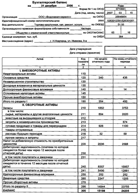 Приложение 2 Бухгалтерская отчетность ООО «Водоканал-сервис» за 2006г. (формы №№ 1 и 2)
