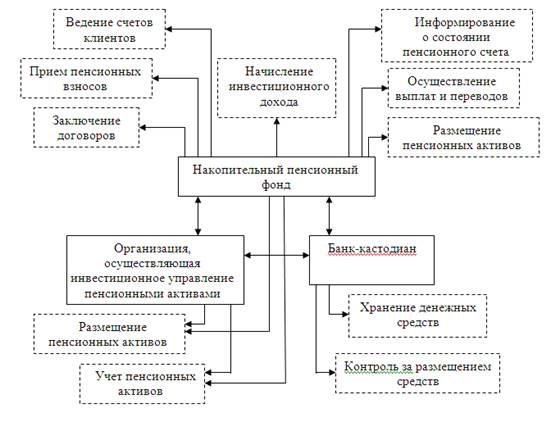 Рисунок 1 - Взаимодействие участников накопительной пенсионной системы Республики Казахстан Накопительные пенсионные фонды входят в число важных социально-экономических институтов, распоряжающихся долгосрочными финансовыми ресурсами и являются наиболее активными институциональными инвесторами в экономике. Казахстанские накопительные пенсионные фонды осуществляют свою деятельность на основании соответствующей лицензии, выдаваемой Агентством РК по регулированию и надзору финансового рынка и финансовых организаций, которой гарантируется то, что пенсионный фонд специализируется исключительно на негосударственном пенсионном обеспечении. Накопительные пенсионные фонды работают над тем, чтобы ваши отчисления работали на экономику страны и приносили вам так называемый инвестиционный доход. При этом деятельность пенсионных фондов строго регулируется государством, что позволяет свести к минимуму инвестиционные риски. Если пенсионный фонд несет определенные потери, то он обязан возместить вам ущерб. Пенсионными фондами управляют управляющие компании, которые вырабатывают стратегию вложений средств. В результате такой системы вы, не прилагая усилий, не только копите на свою старость, но и имеете возможность получать инвестиционный доход со своих отчислений, ваши деньги работают на экономику страны, и бюджет несет минимальные потери на социальное обеспечение пенсионеров. В то же время если вас не устраивают результаты работы фонда, к примеру, уровень дохода, то вы вправе поменять фонд и перенести свой пенсионный капитал в другой фонд, где, на ваш взгляд, более оптимальные возможности для роста инвестиционного дохода капитала /12/. На 1 января 2010 года функционировало 14 накопительных пенсионных фондов, а на 1 ноября 2010 года их количество на пенсионном рынке уменьшилось до 13. НПФ в процессе осуществления своей деятельности могут производить сбор пенсионных взносов, получать комиссионные вознаграждения за свою деятельность и осуществлять иные права согласно условиям пенсионного договора, заключать договора с организацией, осуществляющей инвестиционное управление пенсионными активами. В то же время, накопительные пенсионные фонды обязаны: - производить пенсионные выплаты получателям; - проводить индивидуальный учет пенсионных накоплений и выплат; - предоставлять вкладчику и получателю информацию о состоянии его пенсионных накоплений не реже одного раза в год, а также по его запросу; - обеспечивать конфиденциальность информации о состоянии пенсионных накоплений получателя; - нести ответственность за нарушение пенсионного законодательства и условий пенсионного договора; - по заявлению получателя переводить его пенсионные накопления из одного фонда в другой; - публиковать статистическую и иную информацию о своей деятельности за стандартные периоды времени в один, три, пять, десять календарных лет, при этом не допускается публикация информации, содержащей гарантии или обещания доходов по вкладам в накопительные пенсионные фонды; - обеспечивать равные условия гражданам, заключившим пенсионный договор; - выполнять другие обязанности в соответствии с законодательством РК. Они законодательно обязаны ежегодно проводить аудит и определять соответствие размеров пенсионных резервов текущей стоимости обязател