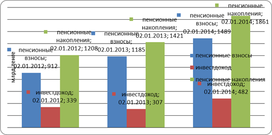 Из приведенной таблицы видно, что прирост пенсионных накоплений с начала 2009 года составил 440,0 млрд. тенге. Среднемесячный прирост пенсионных накоплений составил 36,7 млрд. тенге. На 1 января 2010 года наибольшую сумму пенсионных накоплений имели 4 фонда: «Народного Банка Казахстана» - 559,8 млрд. тенге (30,1%), «ГНПФ» – 293,4 млрд. тенге (15,8%), «Ұлар Үміт» - 245,0 млрд. тенге (13,2%), и «БТА Казахстан» - 207,7 млрд. тенге (11,2%) в общем объеме пенсионных накоплений всех фондов или в совокупности, на эти 4 фонда приходилось 70,3% всех пенсионных накоплений. Динамика изменения пенсионных взносов, «чистого» инвестиционного дохода и пенсионных накоплений представлена на Рисунке 15.