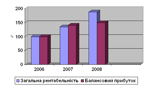 Малюнок 2.2.3. - Динаміка виручки від реалізації послуг та собівартості Динаміка темпів роста балансового прибутку й загальної рентабельності, що наведено на рис. 2.2.4, показує, що темпи роста цих показників становлять відповідно 212% і 188%. На тлі росту абсолютних значень балансовиї прибуток з 9724 тис. грн. в 2006 р. до 20677 тис. грн. і загальної рентабельности з 14,3% в 2006 р. до 26,9% в 2008 р., спостерігається значний ріст матеріальных затрат і собівартості наданих послуг.