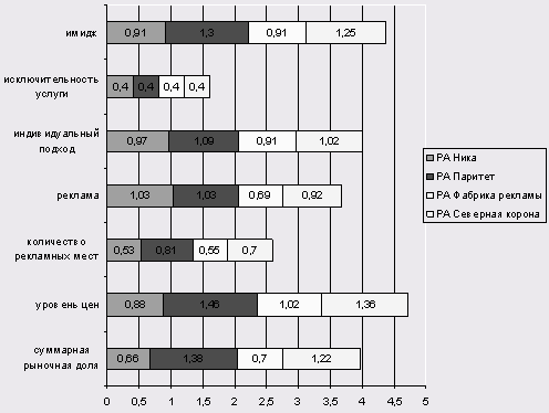 Анализ конкурентоспособности исследуемых организаций показал, что первое место по уровню конкурентоспособности занимает РА "Паритет" (интегральный показатель- 0,95). Это рекламное агентство опережает своего основного конкурента РА "Северная Корона" (интегральный показатель – 0,54) по всем параметрам, кроме такой, как исключительность услуги. Третье место по величине интегрального показателя конкурентоспособности занимает РА "Ника" (интегральный показатель – 0,11). РА "Ника" опережает РА "Фабрика рекламы" (четвертое место - интегральный показатель равен 0,09) по таким показателям, как рекламная деятельность и индивидуальный подход. Графическая интерпретация показателей конкурентоспособности представлена на рисунке 9.