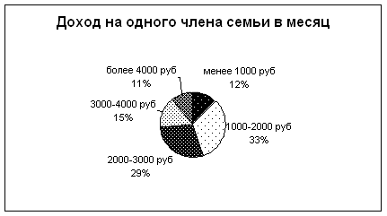 Рисунок 2 – Уровень доходов на одного члена семьи в месяц Государственная поддержка в виде различных выплат кардинально не меняет материальное положение многодетных. Если семья более менее обеспечена, то родители в общем то и не нуждаются в тех незначительных суммах, которые им положены по многодетности. Вместо того чтобы собирать бесконечное количество «бумажек» и простаивать в длинных очередях, они лучше проведут это время, играя со своими детьми. А если проведут это время на работе, то вероятнее всего они заработают намного больше, чем то, что им предлагает государство. Но даже те, кто имеет доход в среднем, к примеру, 2000 рублей на одного члена семьи в месяц, не считают свои семьи обделенными. Конечно же, всем хотелось бы иметь значительно больший доход, но не всегда представляется возможным осуществить это желание. Приведенные цифры говорят о том, что быть многодетными родителями непросто. Кроме социально-экономических и психологических проблем, такие семьи сталкиваются и с определенными проблемами медицинского характера. Иметь о них представление должны любые родители, воспитывающие более 2 детей, – только в этом случае они смогут заранее подумать о том, как обезопасить себя и свою семью. Многодетная семья – это большой коллектив, поэтому актуальной проблемой является проблема инфекционных заболеваний, особенно высококонтагиозных, то есть таких, которыми легко заразиться. Следует отметить, что вакцинация важна не только для детей, но и для взрослых членов семьи, в том числе для мамы в преддверии планируемой следующей беременности [34]. Мама в многодетной семье значительную часть времени проводит в состоянии беременности или лактации. Каждая последующая беременность многодетной мамы подвержена некоторым рискам и осложнениям. Усталость, невозможность восстановиться от родов к родам, особенно если во время предыдущих беременностей и родов имелись осложнения, приводит к тому, что при каждой последующей беременности возрастает риск осложнений, таких, как угроза прерывания беременности, токсикоз, гестоз, неправильное прикрепление плаценты, неправильные положения и предлежания плода и другое. Однако существует и положительное влияние многократных беременностей и продолжительного периода лактации на организм многодетной мамы. Так, много рожавшая женщина практически застрахована от онкологических заболеваний молочной железы, матки и яичников. Известно, что смех, радость и хорошее настроение продлевают продолжительность жизни. А у многодетной мамы поводов для радости гораздо больше, чем у мамы одного малыша. Ведь она радуется за каждый первый шаг, каждое первое слово, каждую «пятерку» в дневнике [34]. Медицинские проблемы многодетной семьи нельзя рассматривать в отрыве от социально-экономических проблем. Так, не секрет, что многодетные семьи можно разделить на два типа: семьи с достаточным бюджетом (их, к сожалению, меньшинство) и семьи с недостаточным бюджетом. В последних очень актуально стоит вопрос правильного питания. А сегодня ни у кого не вызывает сомнения тот факт, что полноценное питание определяется не столько энергетической ценностью пищи и не столько балансом белков, жиров и углеводов, сколько балансом витаминов и минералов. При недостаточности витаминов и микроэлементов возникают неполадки в работ