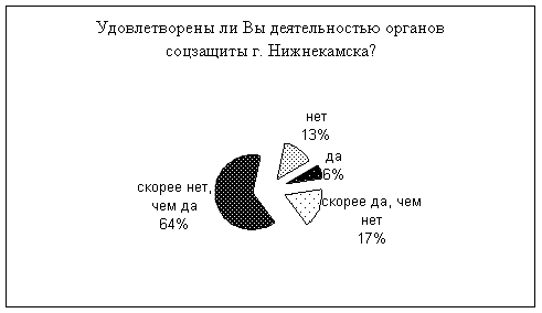 Рисунок 3 – Удовлетворенность деятельностью органов соцзащиты города Нижнекамск Большинство родителей (как и основная часть населения нашей страны) не являются юридически подкованными личностями. То есть подтвердилась гипотеза о том, что многодетные родители плохо информированы о своих правах. И сложность в большей степени заключается не в том, что об их правах им никто не говорит, а в том, что они сами этим мало интересуются. Одна из гипотез была опровергнута: ухудшение социально-экономического положения многодетных семей не связано с иждивенческим поведением родителей в данных семьях. Большинство многодетных родителей на государство вообще не надеется. Негативное влияние на социально-экономическое положение данной категории семей оказывает несоответствие предоставляемых субсидий уровню инфляции в стране. Это, конечно же, касается малообеспеченной части многодетных семей. В результате проведенного исследования был выявлен широкий круг проблем, который существует в современных многодетных семьях города Нижнекамск. Несмотря на всю ту помощь, которая оказывается данным семьям на различных уровнях власти, легче им жить не становится. Возможно, в некоторой степени в этом вина самих родителей, но предполагается, что существует возможность усовершенствования деятельности государственных органов. Соответственно необходимо принимать определенный ряд мер, и, прежде всего, на муниципальном уровне. К тому же, необходимо обеспечить то, чтобы оказываемая многодетным семьям помощь не носила разовый, единичный характер. Необходимо чтобы была разработана и существовала система мероприятий по поддержке многодетных семей. И данная деятельность должна осуществляться непосредственно со стороны муниципальных органов власти. Предполагается, что это будет осуществлено в рамках начавшегося Года Семьи. И будет продолжать действовать вне зависимости от того, какую социальную направленность будут иметь последующие годы по Российской Федерации в целом, и в частности по Республике Татарстан. 3. Мероприятия по совершенствованию деятельности органов социальной защиты в области поддержки многодетных семей 3.1 Российский и зарубежный опыт деятельности органов социальной защиты в области поддержки многодетных семей Как было выяснено в предыдущей главе, многодетные семьи в нашей стране, республике и нашем городе испытывают много трудностей. В ходе проведенного исследования был сделан вывод о том, что главная проблема заключается в отсутствие системности, всеохватности, широкомасштабности мер поддержки многодетных семей. Среди многодетных родителей существует серьезная неудовлетворенность размером выплат со стороны государства, работой органов социальной защиты. В связи с чем предполагается предложение определенных мер по реформированию и усовершенствованию системы поддержки данной категории семей. Но для начала предлагается рассмотреть опыт в этой области зарубежных стран. Озабоченность демографическими тенденциями стала все больше проявляться в 30-40-х годах, а во Франции в силу исторических условий ее развития резкое падение рождаемости началось еще в первые десятилетия XIX века. Реакцией на эти процессы стали попытки проведения демографической политики в государственном масштабе. В 1946 году во Франции была введена 