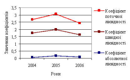 Рисунок 2.4 – Значення коефіцієнтів капіталізації Іншою групою показників, які показують можливість підприємства виконати короткострокові зобов’язання та характеризують діяльність будь-якого підприємства є показники ліквідності. Зробимо оцінку ліквідності підприємства. Ліквідність означає здатність перетворити актив у гроші швидко й без втрат його ринкової вартості [4]. Залежно від ступеня ліквідності, тобто швидкості перетворення в кошти, активи підприємства розділяються на наступні групи: А-1. Найбільш ліквідні активи – до них відносяться всі статті грошових коштів підприємства та поточні фінансові інвестиції. А-2. Швидко реалізовані активи – до цієї групи активів відносяться активи, для обігу яких в грошовій формі потрібно більш тривалий проміжок часу: готова продукція, товари, дебіторська заборгованість, векселя отримані. Ліквідність цих активів залежить від суб’єктивних та об’єктивних факторів: своєчасна відгрузка продукції, оформлення банківських документів, від попиту на продукцію та її конкурентоспроможності, платоспроможності покупців, видів розрахунку. А-3. Повільно реалізовані активи – Витрати майбутніх періодів, оборотні активи, які не ввійшли в попередні дві групи. А-4. Важко реалізовані активи – до цієї групи відносяться активи підприємства, вартість яких відображена в першому розділі активу балансу. Пасиви балансу групуються по ступеню терміновості їхньої оплати: П-1. Найбільш термінові зобов'язання – до них відноситься кредиторська заборгованість по придбаним товарам, роботам, послугам. П-2. Короткострокові пасиви – до цієї групи відносяться короткострокові позикові кошти, поточні зобов’язання, статті четвертого розділу пасиву балансу без кредиторської заборгованості за товари, роботи, послуги та статті другого і п’ятого розділів пасиву балансу, з урахуванням сум, які планують виплатити протягом 12 місяців, починаючи з дати складання балансу або протягом одного операційного циклу, якщо він не перевищує 12 місяців. П-3. Довгострокові пасиви – Ця група пасивів представлена довгостроковими зобов’язаннями підприємства, відображеними в третьому розділі пасиву балансу, а також статтями другого і п’ятого розділів пасиву балансу, не віднесеними до другої групи. П-4. Постійні пасиви – це статті першого розділу пасиву балансу. Для визначення ліквідності балансу варто зіставити підсумки наведених груп по активу й пасиву. Баланс вважається абсолютно ліквідним, якщо мають місце наступні співвідношення: А-1 > П-1 А-2 > П-2А-3 > П-3 А-4 < П-4Якщо виконуються перші три нерівності в даній системі, то, як наслідок, справджується і четверта нерівність. Тому важливо порівняти підсумки перших трьох груп по активу й пасиву. Інакше кажучи, при проведені оцінки ліквідності балансу враховуються оборотні активи підприємства та залучені джерела фінансування. Якщо одне або декілька нерівностей системи мають протилежний знак від зафіксованого в оптимальному варіанті, то ліквідність балансу в більшій або меншій мірі відрізняється від абсолютної. При цьому теоретично недолік коштів по одній групі активів компенсується їх надлишком по другій групі в вартісній оцінці, але в реальній ситуації менш ліквідні активи не можуть замінити в повному обсязі більш ліквідні. Порівняння підсумків першої групи по активу та пасиву від