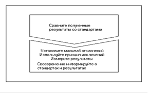 Рис.2 Второй этап процесса контроля Масштаб допустимы отклонений и принцип исключения. Показатель результативности дает четкую и ясную цель для направления усилий членов организации. За исключением ряда специальных случаев, организациям редко бывает необходимо не отклоняться от поставленной цели. На самом деле, одна из характерных черт хорошего стандарта системы контроля состоит в том, что в нем содержатся реалистичные допуски параметров цели. Определение масштаба допустимых отклонений - вопрос кардинально важный. Если взять слишком большой масштаб, то возникающие проблемы могут приобрести грозные очертания. Но, если масштаб слишком маленький, то организация будет реагировать на очень большие отклонения, что весьма разорительно и требует много времени. Такая система контроля может парализовать и дезорганизовать работу организации. В подобных ситуациях достигается высокая степень контроля, но процесс контроля становится не эффективным. Для того чтобы контроль был эффективным он должен быть экономным. Преимущества системы должны перевешивать затраты на ее функционирование. Один из способов возможного увеличения экономической эффективности контроля состоит в использовании метода управления по принципу исключения. Состоит он в том, что система контроля должна срабатывать только при наличии заметных отклонений от стандартов. Измерение результатов: Измерение результатов, позволяющих установить, насколько удалось соблюсти установленные стандарты, - это самый трудный и дорогостоящий элемент контроля. Для того чтобы быть эффективной, система измерения должна соответствовать тому виду деятельности, который подвергается контролю. Необходимо выбрать единицу измерения такую, которую можно преобразовать в те единицы, в которых выражен стандарт. Равно важно, чтобы скорость, частота и точность измерений тоже были согласованы с деятельностью, подлежащей контролю. Любая система сбора и обработки информации относительно дорога. Стоимость проведения измерений зачастую бывает наиболее крупным элементом затрат во всем процессе контроля. Часто именно этот фактор определяет, а стоит ли вообще осуществлять контроль. Потому, в частности из-за высокой стоимости измерений менеджер должен избегать искушения измерить все и как можно точнее. (В коммерческой деятельности цель проведения измерений состоит в увеличении прибыли, а не в том, чтобы установить, что же происходит на самом деле). Для того чтобы система контроля действовала эффективно, необходимо обязательно довести до сведения соответствующих работников организации как установленные стандарты, так и достигнутые результаты. Подобная информация должна быть точной, поступать вовремя и доводиться до сведения ответственных за соответствующий участок работников в виде, позволяющем легко принять необходимые решения и действия. Желательно также быть полностью уверенным, что установленные стандарты хорошо поняты сотрудниками. Это означает, что должна быть обеспечена эффективная связь между теми, кто устанавливает стандарты и теми, кто должен их выполнять. На заключительной стадии этого этапа контроля должна быть дана оценка информации о результатах. Менеджер должен решить, та ли, что нужна информация получена и важна ли она. Важная информация - такая информация, кот