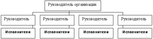 Рисунок 2 – Функциональная организационная схема Например, рабочий в цехе получает поручения не от одного человека (мастера), а от нескольких штатных единиц, т.е. действует принцип многократной подчинённости. Поэтому такую организационную структуру называют многолинейной. Функциональная структура управления производством нацелена на выполнение постоянно повторяющихся рутинных задач, не требующих оперативного принятия решений. Функциональные службы обычно имеют в своём составе специалистов высокой квалификации, выполняющих в зависимости от возложенных на них задач конкретные виды деятельности. К преимуществам такой структуры можно отнести: · сокращение звеньев согласования; · уменьшение дублирования работ; · укрепление вертикальных связей и усиление контроля за деятельностью нижестоящих уровней; · высокая компетентность специалистов, отвечающих за выполнение конкретных функций; К недостаткам: · неоднозначное распределение ответственности; · затруднённая коммуникация; · длительная процедура принятия решений; · возникновение конфликтов из-за несогласия с директивами, так как каждый функциональный руководитель ставит свои вопросы на первое место; Линейно - функциональная структура (штабное управление) представляет собой комбинацию линейной структуры с системой выделения определённых функций. При линейных руководителях создаются специальные подразделения (штабы), которые помогают линейному менеджеру в выполнении отдельных функций управления. Эти штабы могут: · ограничиваться центральными уровнями управления (штабы руководства); · находиться в нескольких уровнях управления; · образовывать штабную иерархию на всех уровнях управления. Штабы на нескольких уровнях иерархии должны давать консультации и участвовать в подготовке решений, но они не обладают правами принятия решений и руководства нижестоящими подразделениями или исполнителями. Чем крупнее фирма и сложнее её управляющая структура, тем острее стоит вопрос координации деятельности функциональных служб или создания крупных специализированных подразделений с высококвалифицированными специалистами. Преимуществами и недостатками линейно-функциональной структуры можно назвать: Преимущества: · возможность получить высокую степень профессиональной специализации сотрудников; · точно определить места и необходимые ресурсы (особенно кадров); · способствует стандартизации, формализации и программированию процесса; Недостатки: · затрудняет горизонтальное согласование; · с трудом реагирует на изменение; Линейная организационная структура с перекрёстными функциями. При такой организационной структуре сохраняется движение по инстанциям, но определённые функции, относящиеся ко всему предприятию, например, кадровая политика, подготовка производства, учёт и отчётность, планирование сроков и контроль за их выполнением и т.д. выделяются в функциональные отделы, которым предоставляются полномочия для дачи распоряжения. Руководители линейного и функционального отделов имеют право на совместное принятие решений для соответствующего отдела предприятия. Например, право по найму рабочей силы для цехов принадлежит совместно начальнику отдела кадров и начальнику технического отдела. Если они не приходят к соглашению, то должна вмешаться вышест