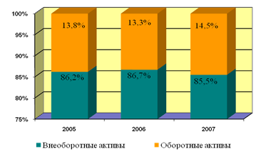 Структура актива баланса РУП "Белтелеком" на протяжении анализируемого периода была достаточно однородна: колебания в сторону роста или снижения доли внеоборотных или текущих активов не составляли более 1-2 проц. пунктов. Так, доля внеоборотных активов в структуре имущества РУП "Белтелеком" составляла более 85%, а доля оборотных активов сохранялась примерно на уровне 13-15% (таблица 2.4, 2.5, рисунок 2.1). Отмечен ежегодный рост имущества в целом (валюты баланса) в абсолютном выражении, темп роста составлял 118-119%.