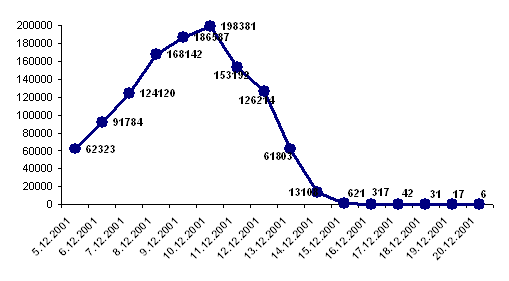 Рис.1. Моніторинг проведення опитування населення За результатами моніторингу також встановлено, що 98,9% переписної документації заповнено шляхом опитування населення за основним місцем проживання під час обходу житлових приміщень. Основні характеристики щодо осіб, якими обліковці не змогли з тих чи інших причин поспілкуватися особисто, у відповідності з чинними нормативно-правовими актами було отримано на підставі даних служб паспортизації, реєстрації і міграційної роботи та інших адміністративних джерел. У таких переписних листах обов’язково проставлялася відповідна резервна мітка. Загалом наведені дані підтверджують висновок, що громадяни України з повним розумінням сприйняли необхідність та надзвичайне значення такого загальнодержавного заходу як перепис населення і в переважній більшості свідомо виконали свій громадянський обов’язок. Чітка робота усіх задіяних виконавців забезпечувалася координацією їх дій і щоденною оцінкою поточної ситуації. Здійснюваний моніторинг дозволяв у ході всього опитування населення контролювати виконання організаційного плану і відстежувати забезпечення охоплення респондентів опитуванням по кожному регіону області. Рівненська область на кінець перепису попала в перелік областей, де показник охоплення населення переписом перевищив розрахункові оцінки. З 16 до20 грудня проводився контрольний обхід приміщень, який ставив за мету контроль забезпечення охоплення респондентів опитуванням та перевірку якості заповнення переписної документації. Усі особи, які повинні були бути переписані, але з якихось причин були пропущені, записувалися до списку і на них заповнювалася переписна документація. Приймання матеріалів Всеукраїнського перепису населення тривало до 1 лютого 2002 року. У період приймання матеріалів здійснювали розбирання і перевірку контрольних бланків, які були застосовані для забезпечення повноти і якості переписних даних, виключення можливих пропусків та подвійних записів у переписній документації. Загалом під час проведення перепису населення було складено 1814 контрольних бланків, серед них 1227 бланків внутрішньо-районної міграції, 587 бланків міжобласної міграції. Після завершення цієї роботи переписну документацію було скомплектовано і передано спеціальним підрозділам з кодування даних для подальшої їх підготовки до автоматизованого оброблення. Сьогодні автоматизована обробка даних Всеукраїнського перепису населення 2001 року в стадії завершення. В обласному управлінні статистики, зокрема, відділом демографічної статистики та перепису населення проаналізовані вихідні таблиці п’яти черг, що передбачені програмним забезпеченням оброблення даних Перепису. На основі формування зведених даних написані економічні доповіді, експрес-записки, випущені збірники, бюлетені, буклети про результати проведення ВПН на Рівненщині. У своїй роботі, згідно з Програмою Перепису населення нижче проаналізуємо демографічну ситуацію в Рівненській області за даними Всеукраїнського перепису населення 2001 року. 2.4 Поточний облік населенняПоточний облік демографічних подій полягає у збиранні відомостей про випадки народжень, смерті, укладання та розірвання шлюбу. Основними джерелами даних про природний рух населення є акти реєстрації громадського стану. Специф