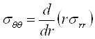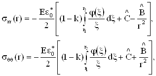 Відповідно підставивши цей вираз у співвідношення (2.5) та виконавши відповідні математичні перетворення, отримано вирази для розрахунку залишкових напружень у будь-якій точці тонколистової дискової деталі із технологічним отвором радіусом R0 та обмеженим радіусом R.