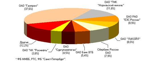 Рис. 6. Темпы изменения индекса РТС и основных мировых фондовых индексов На ФБ ММВБ средний дневной объем вторичных торгов акциями в декабре увеличился по сравнению с ноябрем на 4,3% — до 70,6 млрд. рублей. В РТС аналогичный показатель сократился на 3,5% — до 64,0 млн. долл. США. Капитализация рынка акций в РТС за месяц возросла на 5,6% и на 28 декабря составила 1328,8 млрд. долл. США. В структуре совокупных вторичных торгов на трех основных российских фондовых биржах (ФБ ММВБ, РТС, ФБ "Санкт-Петербург") в рассматриваемый период круг высоколиквидных бумаг был по-прежнему ограниченным. Основная доля операций осуществлялась с акциями нескольких компаний-эмитентов нефтяной, газовой, металлургической, электроэнергетической отраслей, а также кредитных организаций. На долю акций 8 ведущих эмитентов приходилось 87,8% суммарного торгового оборота.