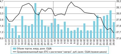 В рассматриваемый период Банк России в целях сглаживания резких колебаний валютного курса перешел к операционному ориентиру, основанному на использовании корзины из евро и доллара США вместо применявшейся до этого привязки рубля к одной валюте - доллару США. В результате волатильность динамики курса евро к рублю в феврале уменьшилась по сравнению с декабрем на 15% (в указанные месяцы значения волатильности курса евро к доллару США были сопоставимыми), в то время как волатильность изменения курса доллара США к рублю выросла всего на 4%. Для сглаживания резких колебаний рублевой стоимости корзины и обеспечения сбалансированности спроса и предложения валюты Банк России осуществлял в феврале масштабные интервенции на внутреннем валютном рынке. Объем покупки иностранной валюты Банком России составил в рассматриваемый период около 10 млрд. долл. США, при этом больше 90% от объема интервенций пришлось на вторую половину февраля. В результате проведения Банком России операций на внутреннем валютном рынке золотовалютные резервы Российской Федерации возросли за рассматриваемый период на 7,4% - до 134,2 млрд. долл. США. По состоянию на 1 февраля и 1 марта 2004 г. курс американской валюты к рублю составил соответственно 28,11 и 27,70 руб./долл. (снижение на 1,5%), курс евро к рублю был равен 36,59 и 36,72 руб./евро (повышение на 0,4%). По предварительной оценке, среднемесячный реальный эффективный курс рубля вырос относительно декабря 2004 г. на 4,3%, среднемесячный реальный курс рубля к доллару США увеличился на 3,2%, к евро - на 6,9%. Рисунок 2. Совокупный объем торгов на ММВБ